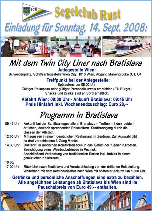 Kosten: TwinCityLiner Euro 28,-- Bratislava: Örtliche Reiseleiter, 3-Gang Menü zu Mittag, Nachmittagsimbiss, Komfortbus in Bratislava und Rückfahrt nach Wien Euro 49,-- Gesamt: Euro 77,-- pro Person. Stornobedingungen beim TwinCityLiner: bis 48 Stunden vor Fahrtantritt 50%, danach sind 100% des Fahrpreises zu entrichten. |