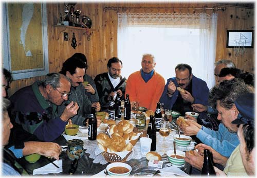 Anschließend gab es im Vorzelt von Franz Pabisch für alle eine heiße Gulaschsuppe - zubereitet und serviert von unseren Frauen - wobei dasselbe logistische Problem wie immer elegant gelöst wurde: Wie schafften es zwanzig Leute, fast gleichzeitig in einem Vorzelt mit einem Fassungsvermögen von maximal 10 Personen, nebeneinander zu sitzen. Wir derpackten es. Maria Hauser versorgte uns liebevoll und mütterlich mit Kaffee. Wir hatten Spaß und Freude an unserer Gemeinsamkeit. Irgendwie wurde deutlich, daß der Frühling naht, und jeder schon im "Startloch scharrt".
