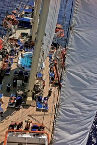 Der typische Tagesablauf begann um 07:00 Uhr früh mit Yoga, gefolgt mit "keep fit", dazwischen Einschulung im Maschinenraum oder Mastklettern, unterbrochen mit Wassergymnastik in einem der beiden Swimmingpools, Karten lesen, navigieren, studieren der Hafenhandbücher mit Vortrag über die Gefahren beim nächsten Landgang, mit Sehenswürdigkeiten und Besonderheiten.