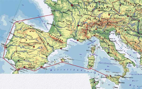Der Hafen-Met-Report spricht von Sturm (8 Bft) südlich der Balearen, in der Ägäis ist ein Tief, Tendenz stationär. Um uns herum ist jedoch prächtiges Wetter, die Balearen haben wir schon hinter uns, vor uns scheint alles paletti.